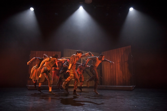 Yann Seabra’s set of three moveable sections that are regularly shifted to form workhouse walls, bunkbeds, streets, Fagin’s den and more is very effective. Alongside it, Jackie Shemesh’s lighting is all shadows, helping to create all the necessary atmosphere and mood. The use of small props (a hat box, yellow handkerchiefs, a watch and chain) is well done, the dance flowing pretty seamlessly as they are passed or tossed from dancer to dancer (no easy task).