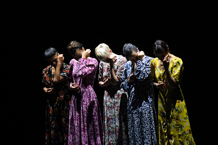 Created in 2022, the lights go up on the 15-minute Bouffées to reveal Mathilde Roussin, Aïda Ben Hassine, Mariana Faria, Salomé Moro and Inès Lopez standing in a line. Looking down, they very slowly wipe their tear-stained cheeks. With each in an old-fashioned, calf-length dress, they could have come straight out of a Pina Bausch classic.