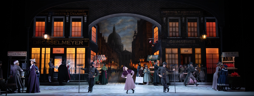 After opening in Drosselemyer’s sweet shop, the viewer is whisked off to designer Dick Bird’s picture-perfect Edwardian London street scene with St Paul’s in the background. It feels wonderfully apt. It’s also very animated. There’s a lot of dancing, and what looks like more than one reference to well-known musicals. Deliberate or otherwise it’s impossible not to think Mary Poppins and Dick van Dyke when the two sweeps appear. Their dance with the young Clara (the excellent Heather Bain) in which they make clever use of their broomsticks is rather inventive. And then there’s Uromys Grimsewer, who has a face just like that, and the bunch of pickpocketing urchins. Oliver Twist, anyone?