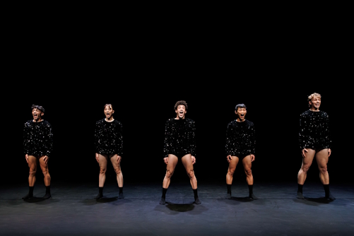 The evening opened and closed with two humorous pieces, starting with German choreographer Andreas Heise’s Frühlingsstimmen (2025) to Johann Strauss II’s score of the same title from 1883. Seven dancers, clad in black shorts and long-sleeved T-shirts full of glittering sparkles, at times undulated with bird-like movements, did funny body rolls or turned as if moved by an external force. They looked like big, black, happy birds having fun.