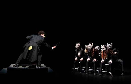 The last piece was company director Eric Gauthier’s hilarious Orchestra of the Wolves (2009) to Ludwig van Beethoven’s Fifth Symphony (1804). Giuseppe Iodice, dressed in tail-coat and wearing a duck’s mask and tail, conducted six dancers in wolf masks, the ‘musicians.’ At the beginning it is very amicable, but slowly the wolf-pack becomes more aggressive, circling in on the conductor. For a while he manages to keep them at bay with authority and his baton, but eventually the pack devours him, yellow feathers flying.