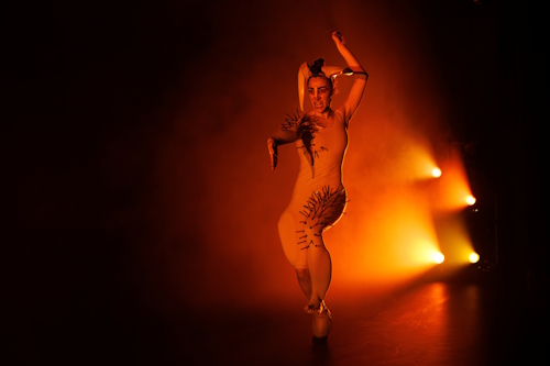 Two of the pieces had strong sexual connotations. Marie Chouinard’s Prélude à l’après-midi d’un faune (1994) to Claude Debussy’s music from 1894, references Vaslav Nijinsky’s famous ballet from 1912 in the movement. But Chouinard takes the ballet several steps further. In a misty glade, a Carolina Fernandes enters clad in a nude-coloured unitard, horns on her head. But there is nothing romantic about her. One thigh is swollen. From the other thigh, and from her opposite shoulder and upper arm, protrude what look like ten-centimentre long nails, which touched other parts of her body every time she squatted. It looked quite scary. At one point she takes off her horns, attaching one to her crotch like an erected penis. She copulates a row of square light columns, before finally relieving herself on the floor. At the end, the audience was quiet for quite a few moments before their applause broke loose.