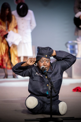 As the playful scene opens, among the many eye-catching sights is Mariana Tembe squished into a washtub, like a baby taking a bath. You wonder how she does it. All is revealed when she extracts herself, scooting across the floor, becoming a police officer. A tragic accident at the age of eight left Tembe without her lower limbs. That didn’t stop her learning to dance. Just like British dancer David Toole, who sadly passed away way to soon, not only does she move with incredible grace and speed, she has that wonderful quality of power. Even when just staring at the audience, she demands to be watched.