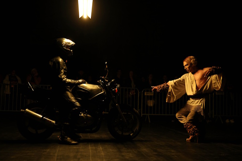 Initially using primarily his voice, it feels like Chaignaud is tearfully pleading with the object of his desires. Has he been spurned? Has something happened and he’s been discarded? Whatever, you sense that he’s dicing with danger here, that there is only so much this creature, the object of his desire, is going to take. A tragic yet slightly comic figure, his dance has more than a hint of flamenco about it. Indeed, at one point, he produces a fantastic few seconds of machine-gun like footwork. It’s also easy to see the motorbike as a bull; calm now, but you feel slowly coming to the boil inside.