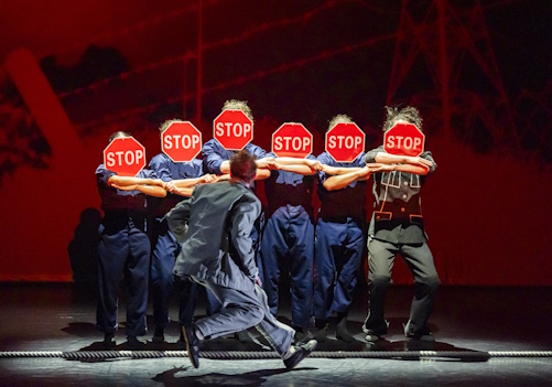 Two white flags open the piece, instantly implying peaceful surrender. The calm, however, is short-lived. Protesters bounce up and down in split-jumps, flags held rigidly, until caught mid-air by workers in hard hats and high vis, triggering giggles from the audience.