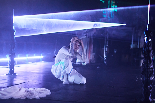 A few moments do land. The clearest come from the music. Chen Yu Xiao (陳雨瀟), playing bamboo flutes and other wind instruments, brings a clean, focused tone that offers brief passages of breath and orientation. Her concentration provides the performance with its most grounded centre. Meanwhile, He, under laser light, lets his mirrored, disco-ball-like top scatter reflections across the room; paired with the handheld laser device. It creates the evening’s only image that approaches the mythic dream-space suggested by Mountains and Seas.