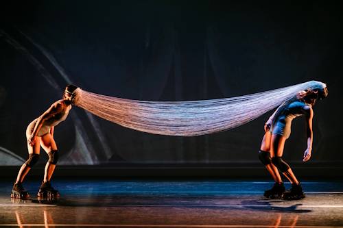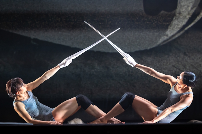 Kilonzo crouches downstage with two long white spikes protruding from his hunched torso, props that later facilitate a ritual. Between Takase and Nakamura, both on foot, runs long white string, attached to and concealing their faces. The pair move back and forth in a subtle pendulum, a movement like an aftereffect of some greater shift. For a while, dance is an understated visual addition to what already feels architecturally curated.