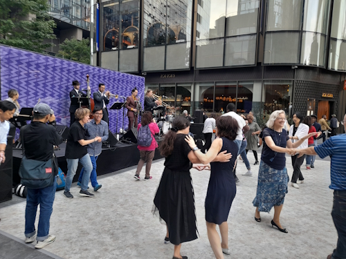 But Works & Process is about more than theatre presentations. The season is also about participation, especially in four early evenings outdoors at Manhattan West. A swing evening with Gaby Cook and the Eyal Vilner Big Band included learning some basics, the chance to dance in a sort of jam, performance, and some fabulous live music. It was great fun, even with a bit of a chill breeze blowing.