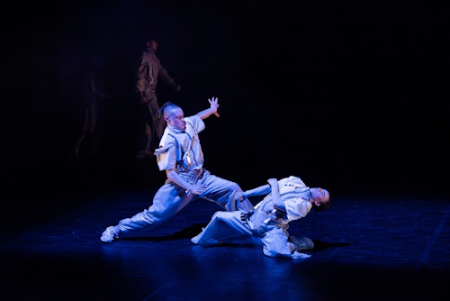 The splendidly innovative choreography by Sandy, is finely tuned to the music, composed by Mikey J, whose soundscape is very dramatic, and gives the feeling of being in the midst of a war zone. This was echoed by the dance, the movement often resembling people being shot.