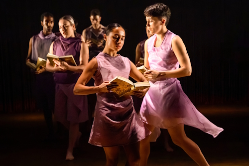 And it is with an ensemble dance, in which much use is made of books, that the work opens. Given Will Duke’s projections that suggest the sun glistening on a gentle sea, and the sound of birds, the inference is that we are on some warm paradise island, although it’s not totally clear. Natnael Dawit stood out in particular here, dancing with lithe grace.