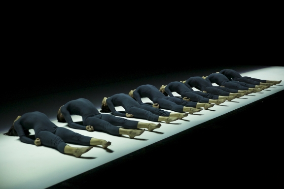 Fortified by a rejuvenating elderflower cordial, we braced ourselves for 8. This one had light. Quite a lot of it and quite bright too. The eight in 8 weren’t bright though. They were grey. Very grey. They seemed to be undertaking some sort of ante-natal class. Crotches thrust towards us, they lay doing more writhing and a bit of heaving for good measure. Every so often a head would pop up to check on progress and then down they went again to have another writhe. Sometimes a leg would flip over and they even managed to wriggle in unison upstage and then slowly downstage again, writhing all the while. That was it. If there was anything else, I missed it.