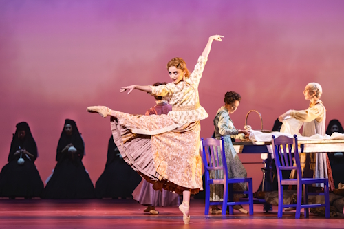 Wheeldon’s command of physical language is most startling in the scenes of desire. He magnifies the language of feet, sculpts bodies into entwined forms, and pushes lifts into disquieting extremes that confront the viewer with both beauty and unease. One of the most compelling sequences involves Gertrudis, danced by Viola Pantuso. Consumed by passion, she abandons all restraint, her body sculpted into shifting statues through multiple lifts; a tableau of shameless surrender to desire.