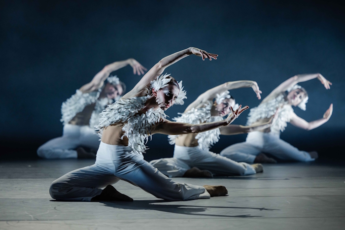 Having dancers enter through the auditorium is nothing new. But the Markowitz and Valverde take it much further. With Michael Borowski’s lighting bathing the audience in blue, the creatures slip in through the doors, gliding not only down the aisles but also along rows making very, very individual eye contact as they do so. They balance confidently on ledges that separate sections of seats. At one point, finding myself in a moving shadow, I turned to discover a swan high above standing on a ledge. The effect is to emphasise the reality of these creatures rather than having them seen purely as distant and mythical. It’s a terrific piece of immersive theatre, yet so simply done.