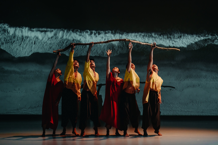 The work makes no distinction between Mudan people and Ryukyuans although the choreography does initially appear to hint at events in the first scenes. As the cast move to the sound of waves, their bodies are tossed as if at sea. Other moments suggest a sea breeze. When they dance with a piece of driftwood, it’s impossible not to initially see the prop as a ship.