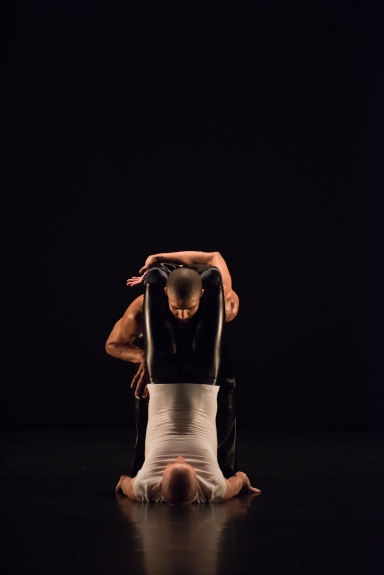 Act II, ‘Land’, opens with the cast in black unitards finished with leather flares, and a stark black backdrop. The dancers come into their element here, rolling and grooving to Patti Smith’s snarls. There is a certain itch or frustration in the movement, amplified by the digital projections that disconcertingly spin between spirals of cascading numbers and pulsating white circles. The piece looses interest when the dancers purely work through classical steps: rather, it is the inclusion of contrasting moments where hands reach between legs and grasp the backs of the thighs, that show Clark’s subtle but exact play between restriction and freedom.