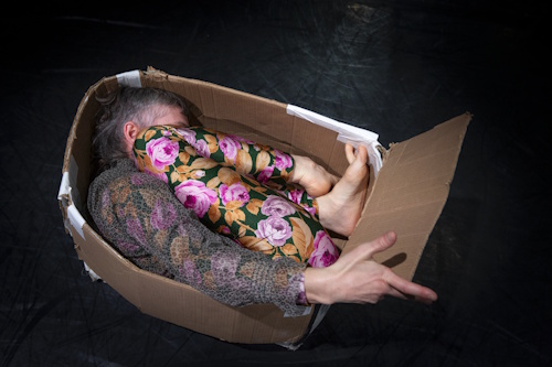 Babette Verbeek is an old grumpy grandmother, who creeps into a cardboard box, closes it and for a long time just lies there, invisible. Later she walks as if crocked and with a cane. She complains about her granddaughter, who keeps kicking her legs or cane so that she falls. Her box mania continues throughout the piece, including attempting to get into boxes much too small for her.
